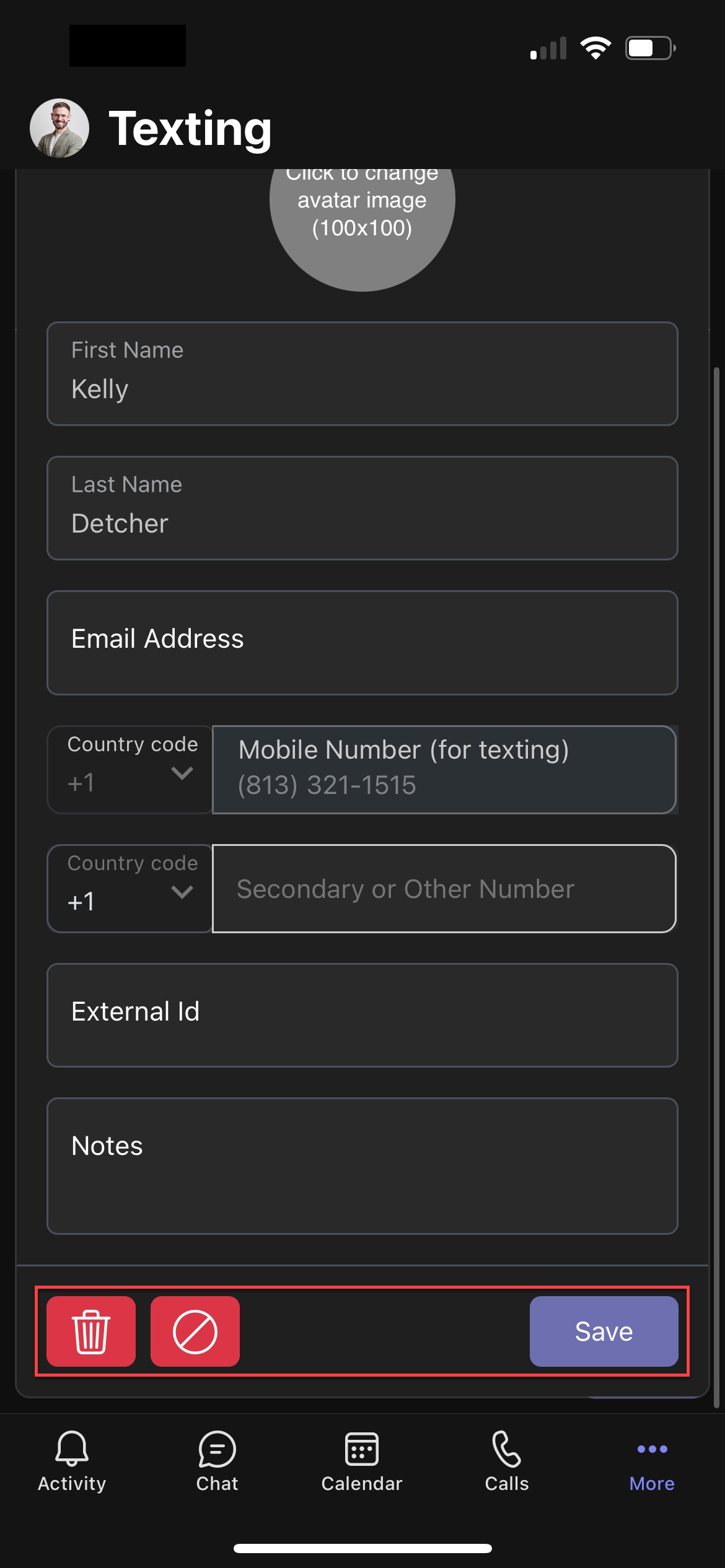 - Select Save to save the contact, the trash icon to delete the contact, or the block icon to block the contact. Note: If deleted, the app only displays the phone number unless you re-add the contact information.