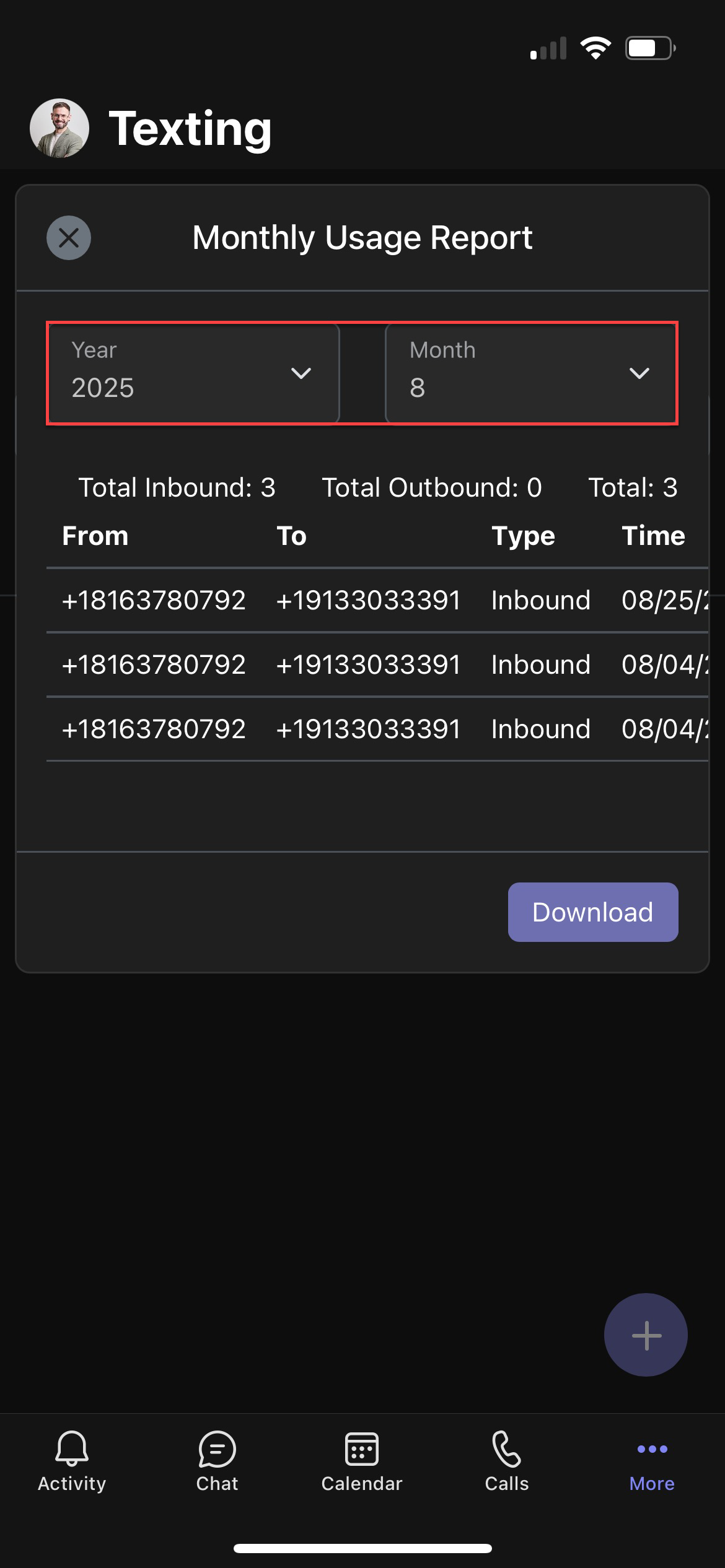 - Based on your selection, the Total Inbound, Total Outbound, and Total overall messaging count appears. You can also view data regarding From, To, Type, and Time related to your messaging.