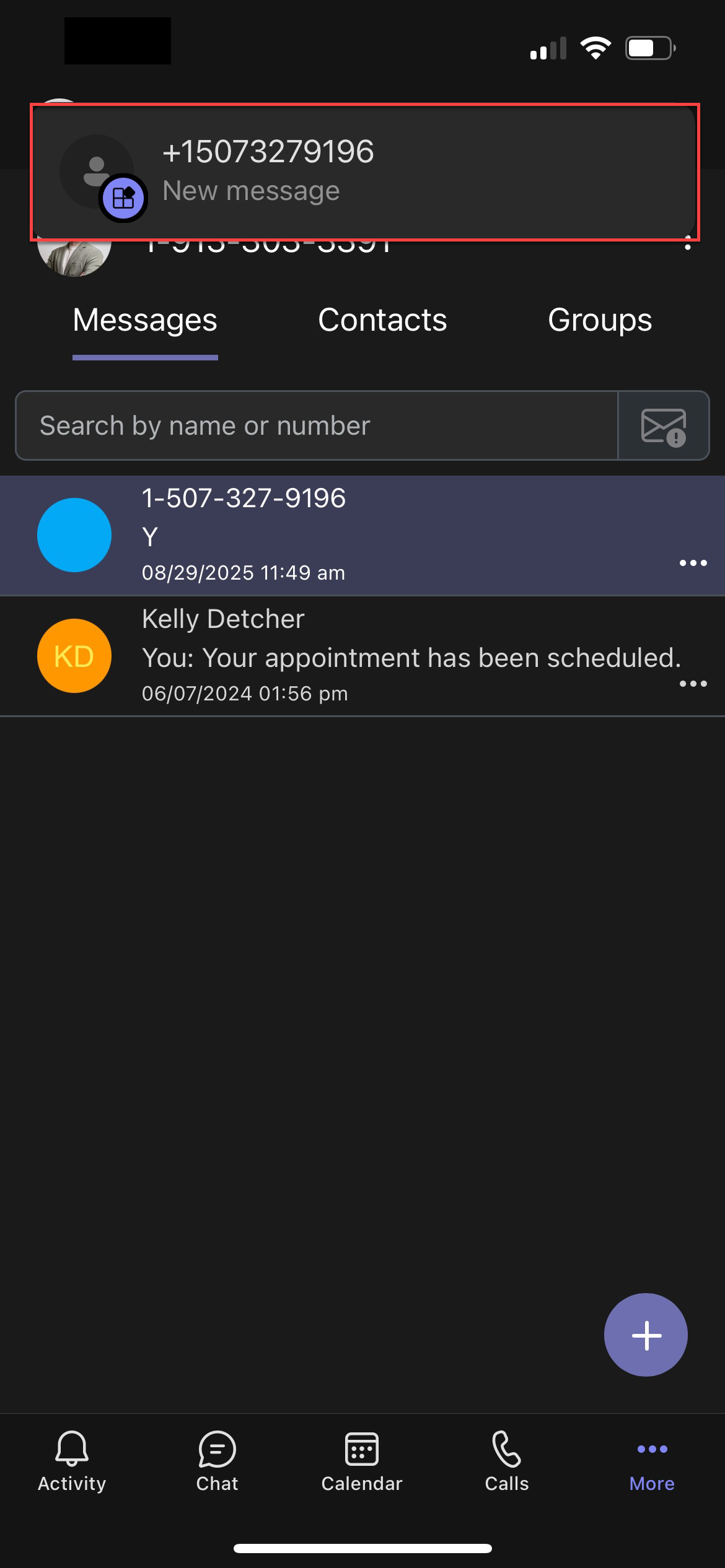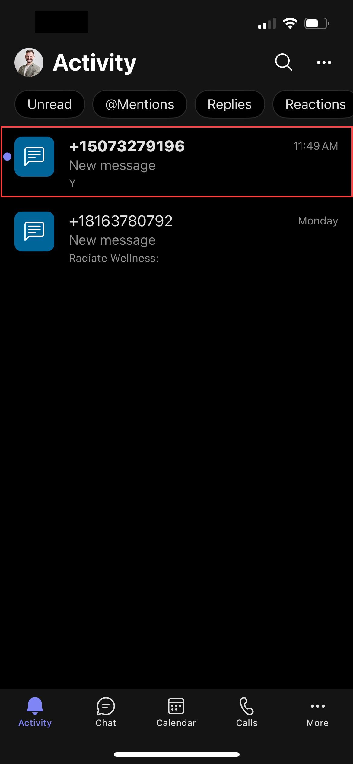 When you receive a new text message, a pop-up notification appears. Additionally, the message notification is indicated under the Activity icon in the Microsoft Teams application.
