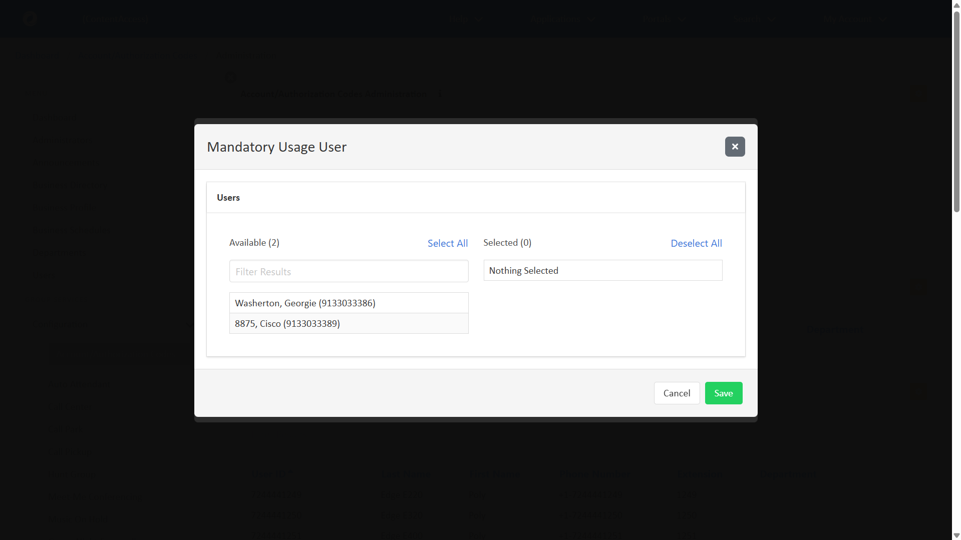 - To manage mandatory usage users, within Mandatory Usage User Table, click the Edit icon. Add Users by selecting them from the Available list. To move all users, click Select All. To remove selected users, click their name within the Selected list. To remove all selected users, click Deselect all. Click Save.