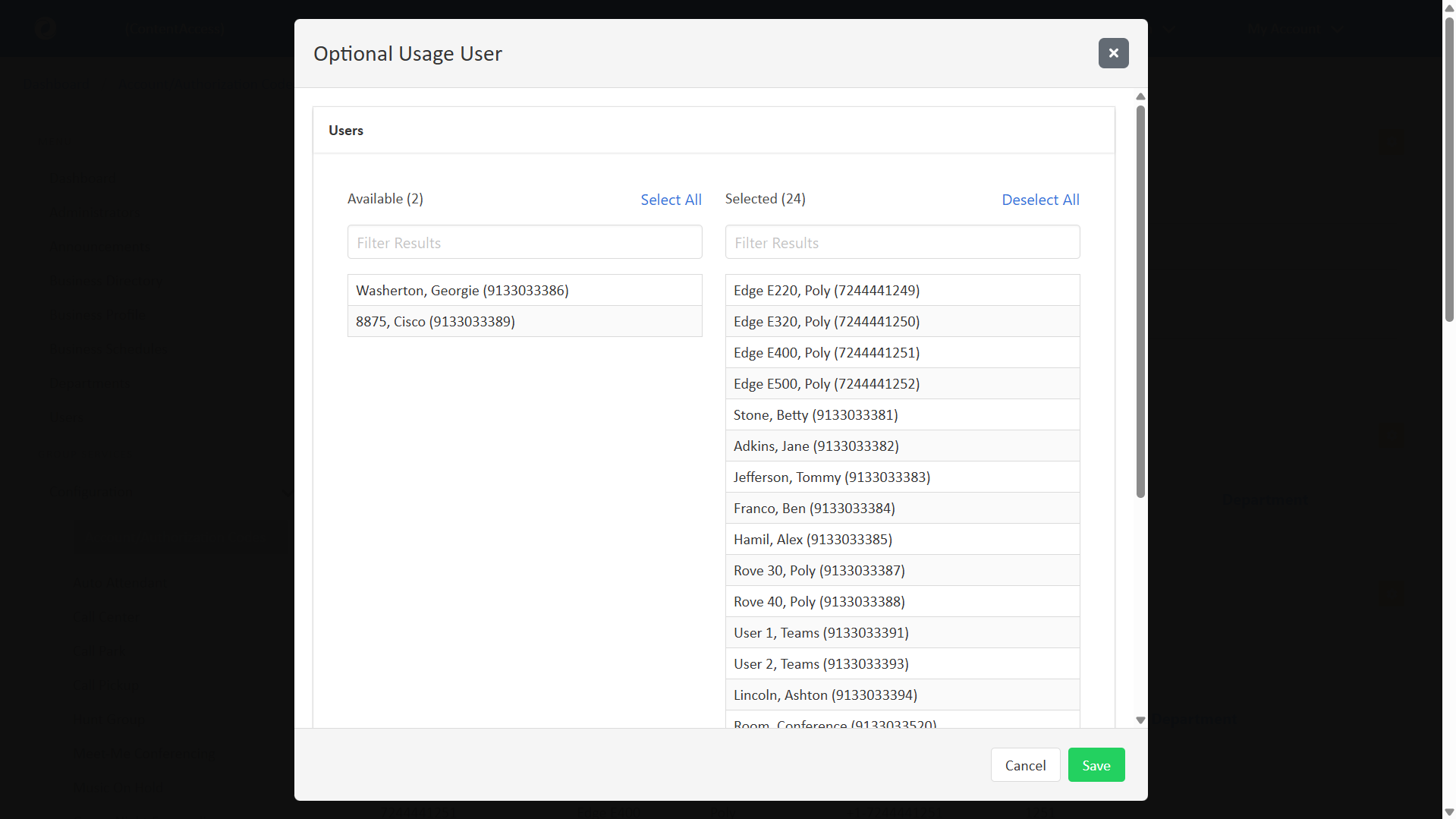 - To manage mandatory usage users, within Optional Usage User Table, click the Edit icon. Add Users by selecting them from the Available list. To move all users, click Select All. To remove selected users, click their name within the Selected list. To remove all selected users, click Deselect all. Click Save.